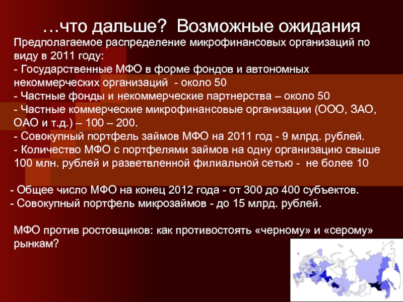 - Совокупный портфель займов МФО на 2011 год - 9 млрд. рублей.