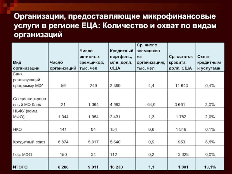 Слайд 4Типология микрофинансовых институтов в регионе Европа и Центральная Азия (ЕЦА)