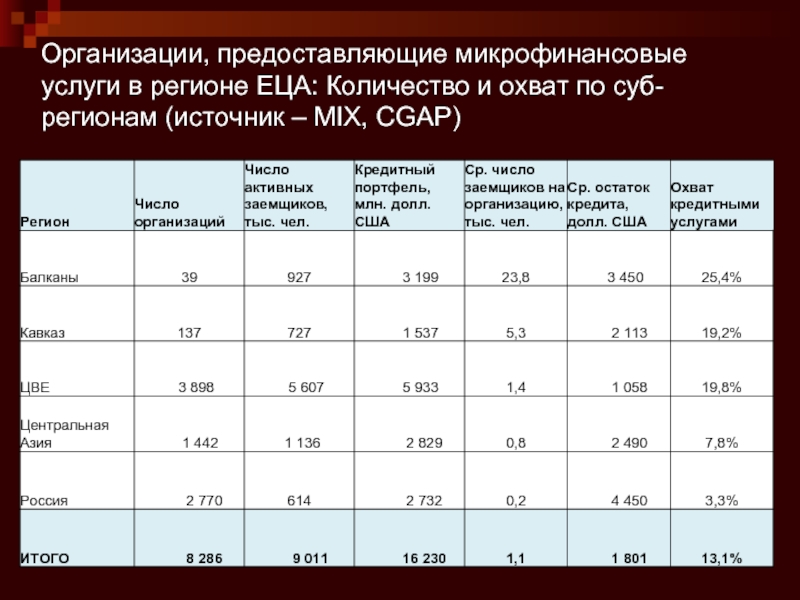 Слайд 7Организации, предоставляющие микрофинансовые услуги в регионе ЕЦА: Количество и охват по