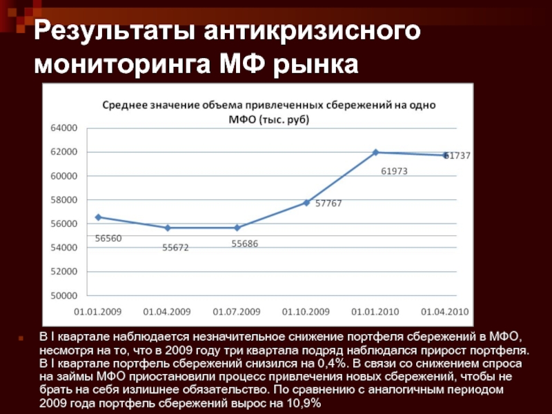 сбережений в МФО, несмотря на то, что в 2009 году три квартала подряд наблюдался прирост портфеля. В I квартале портфель сбережений снизился на 0,4%. В связи со снижением спроса на займы МФО приостановили процесс привлечения новых сбережений, чтобы не брать на себя излишнее обязательство. По сравнению с аналогичным периодом 2009 года портфель сбережений вырос на 10,9%
