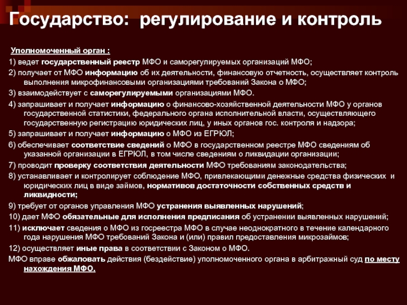 6) обеспечивает соответствие сведений о МФО в государственном реестре МФО сведениям об указанной организации в ЕГРЮЛ, в том числе сведениям о ликвидации организации;