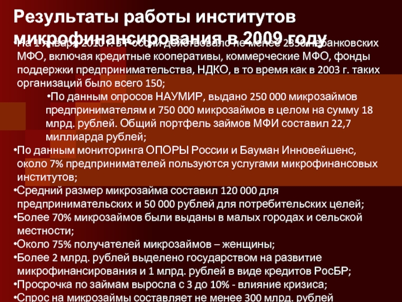 Слайд 11Результаты работы институтов микрофинансирования в 2009 году