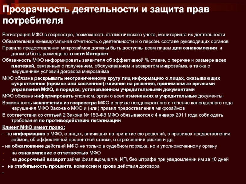 Установление правовых норм по обеспечению прозрачности деятельности МФО (включая публичный характер правил предоставления микрозаймов)