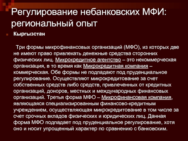 две не имеют право привлекать денежные средства сторонних физических лиц. Микрокредитное агентство – это некоммерческая организация, в то время как Микрокредитная компания – коммерческая. Обе формы не подпадают под пруденциальное регулирование. Осуществляют микрокредитование за счет собственных средств либо средств, привлеченных от кредитных организаций, доноров, местных и международных финансовых организаций. Третья форма МФО – Микрофинансовая компания, являющаяся специализированным финансово-кредитным учреждением, осуществляющая микрокредитование в том числе за счет срочных вкладов физических и юридических лиц. Данная форма МФО подпадает под пруденциальное регулирование, хотя оно и носит упрощенный характер по сравнению с банковским.