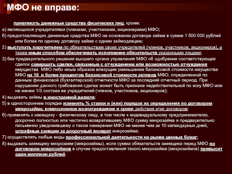 8) выдавать заемщику микрозаем (микрозаймы), если сумма обязательств заемщика перед МФО по договорам микрозаймов в случае предоставления такого микрозайма (микрозаймов) превысит один миллион рублей.
