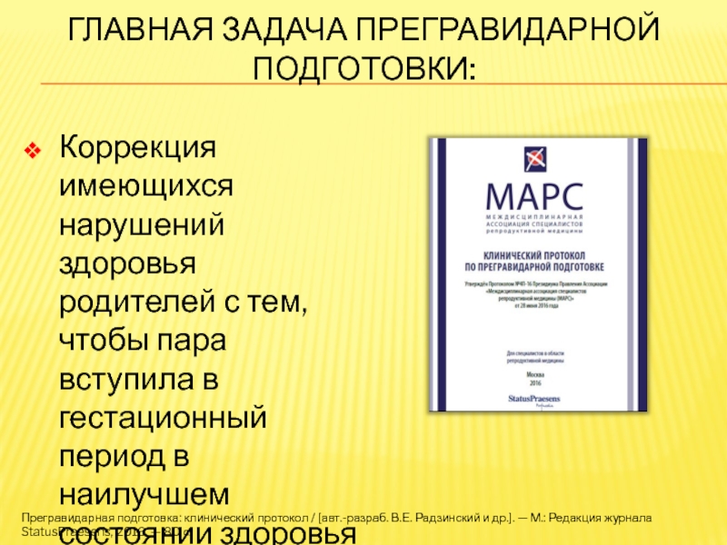 Прегравидарная подготовка: клинический протокол / [авт.-разраб. В.Е. Радзинский и др.]. — М.: Редакция журнала StatusPraesens, 2016. — 80 с.