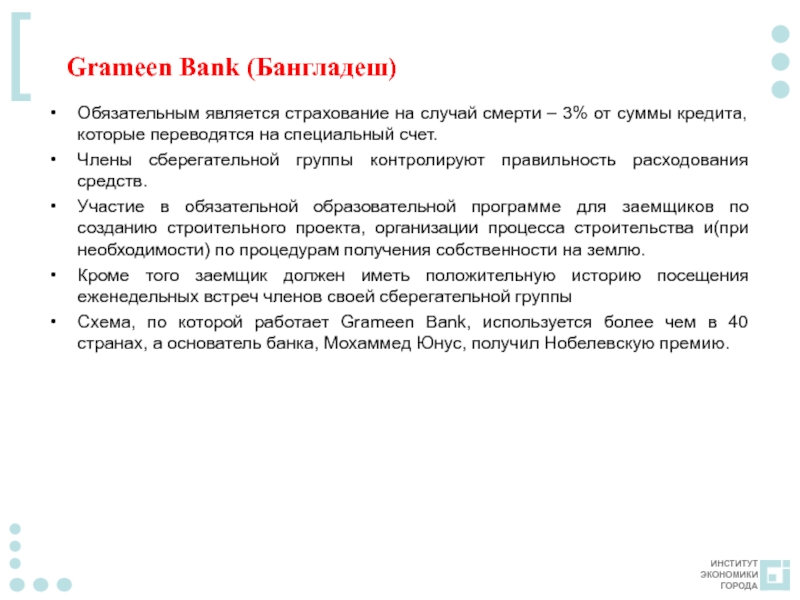 Организация процесса жилищного микрокредитования в Grameen bank
