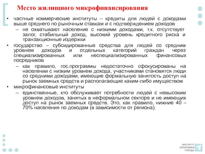 Слайд 3Место жилищного микрофинансирования