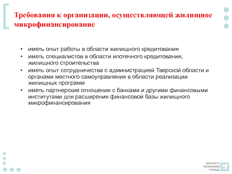 Слайд 21Требования к организации, осуществляющей жилищное микрофинансирование
