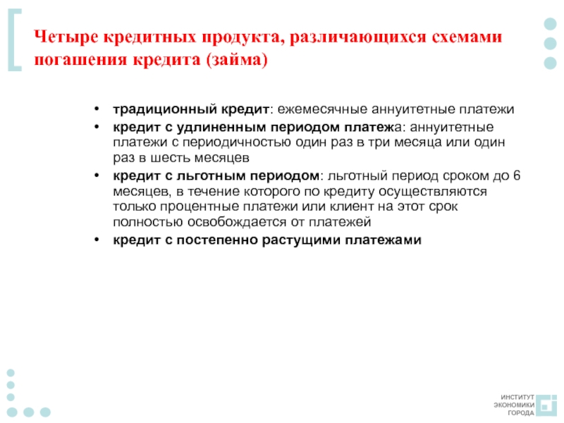 Слайд 15Четыре кредитных продукта, различающихся схемами погашения кредита (займа)