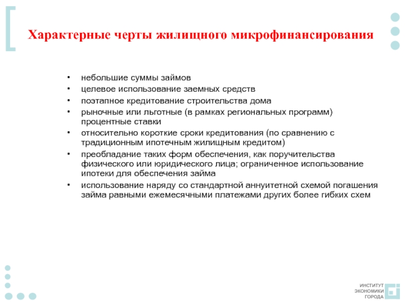 Слайд 5 Характерные черты жилищного микрофинансирования