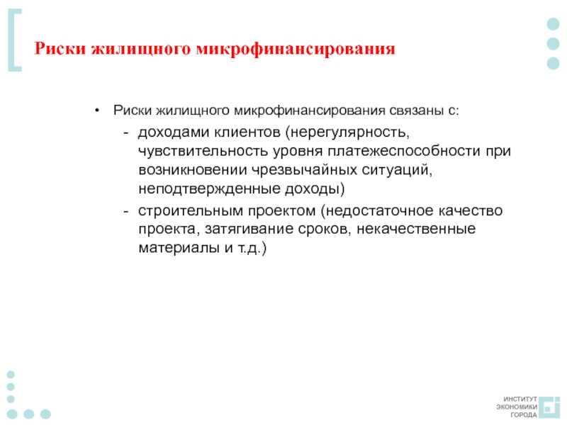 Слайд 18Риски жилищного микрофинансирования