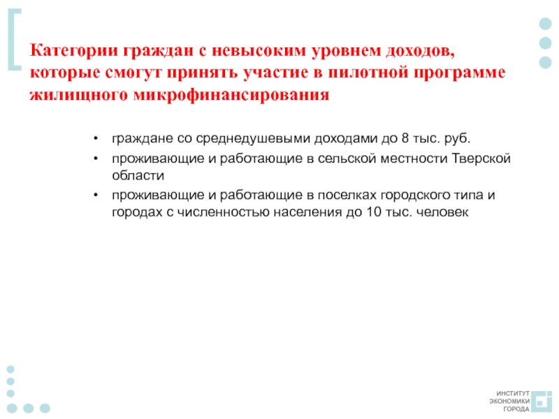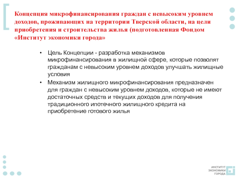 Слайд 11Концепция микрофинансирования граждан с невысоким уровнем доходов, проживающих на территории Тверской
