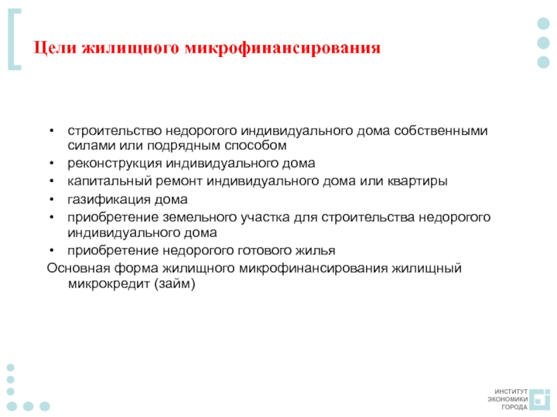 Слайд 13Цели жилищного микрофинансирования