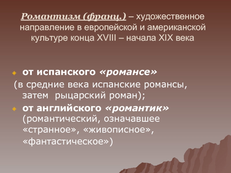 от английского «романтик» (романтический, означавшее «странное», «живописное», «фантастическое»)