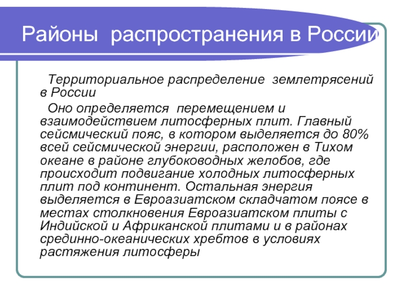 Оно определяется перемещением и взаимодействием литосферных плит. Главный сейсмический пояс, в котором выделяется до 80% всей сейсмической энергии, расположен в Тихом океане в районе глубоководных желобов, где происходит подвигание холодных литосферных плит под континент. Остальная энергия выделяется в Евроазиатском складчатом поясе в местах столкновения Евроазиатском плиты с Индийской и Африканской плитами и в районах срединно-океанических хребтов в условиях растяжения литосферы