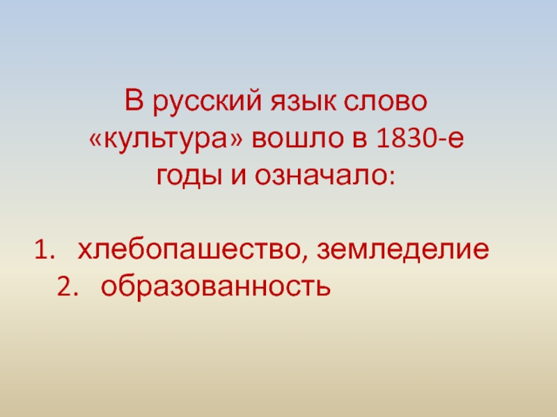 Слайд 8В русский язык слово «культура» вошло в 1830-е годы и означало: