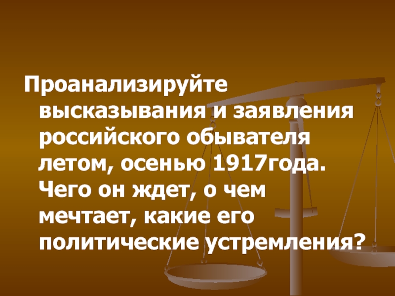 Проанализируйте высказывания и заявления российского обывателя летом, осенью 1917года. Чего он