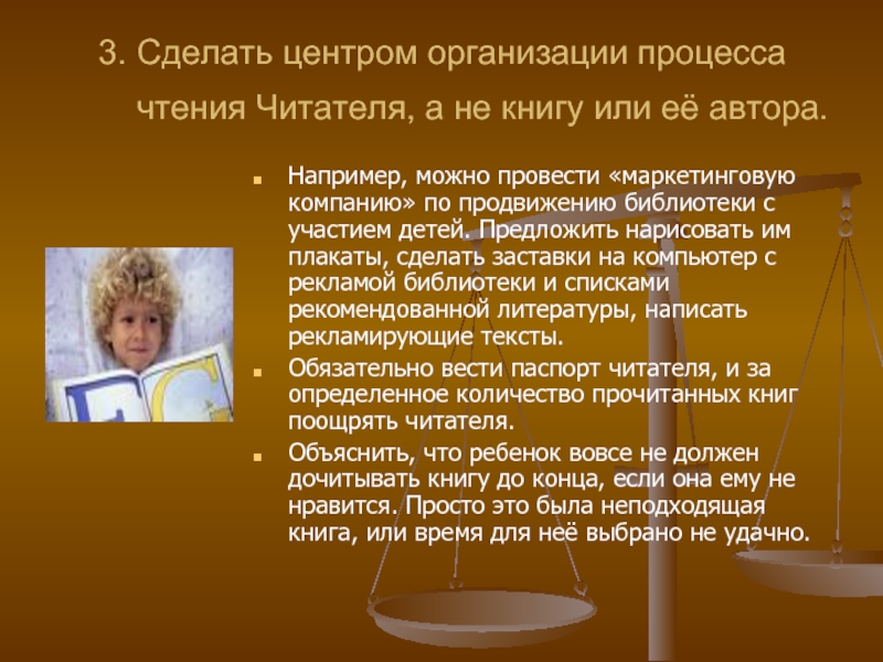 Например, можно провести «маркетинговую компанию» по продвижению библиотеки с участием детей. Предложить нарисовать им плакаты, сделать заставки на компьютер с рекламой библиотеки и списками рекомендованной литературы, написать рекламирующие тексты.