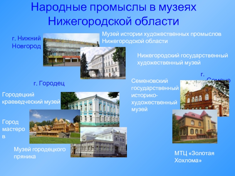 Продукция «Хохломской росписи», Павловского ордена Почета завода имени Кирова, «Семеновской росписи» поставляются на экспорт в Австрию, Германию, Японию, США, Францию, Чехию и другие страны мира