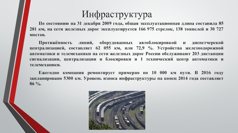 85 281 км, на сети железных дорог эксплуатируется 166 975 стрелок, 138 тоннелей и 30 727 мостов.