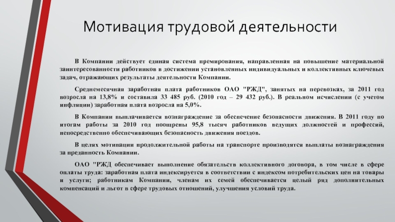 ОАО "РЖД обеспечивает выполнение обязательств коллективного договора, в том числе в сфере оплаты труда: заработная плата индексируется в соответствии с индексом потребительских цен на товары и услуги; работникам Компании, членам их семей обеспечивается целый ряд дополнительных компенсаций и льгот в сфере трудовых отношений, улучшения условий труда.