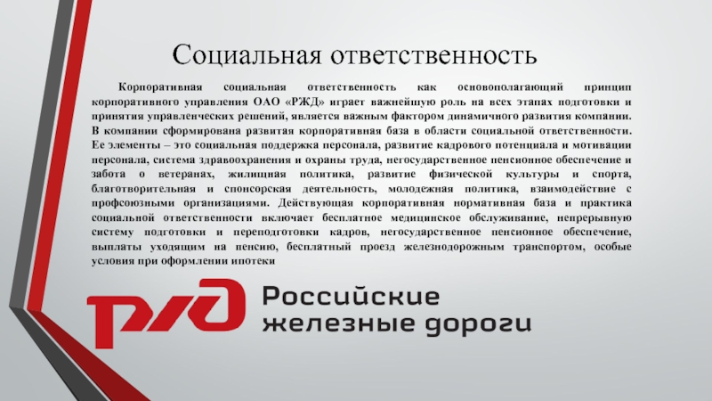 играет важнейшую роль на всех этапах подготовки и принятия управленческих решений, является важным фактором динамичного развития компании. В компании сформирована развитая корпоративная база в области социальной ответственности. Ее элементы – это социальная поддержка персонала, развитие кадрового потенциала и мотивации персонала, система здравоохранения и охраны труда, негосударственное пенсионное обеспечение и забота о ветеранах, жилищная политика, развитие физической культуры и спорта, благотворительная и спонсорская деятельность, молодежная политика, взаимодействие с профсоюзными организациями. Действующая корпоративная нормативная база и практика социальной ответственности включает бесплатное медицинское обслуживание, непрерывную систему подготовки и переподготовки кадров, негосударственное пенсионное обеспечение, выплаты уходящим на пенсию, бесплатный проезд железнодорожным транспортом, особые условия при оформлении ипотеки