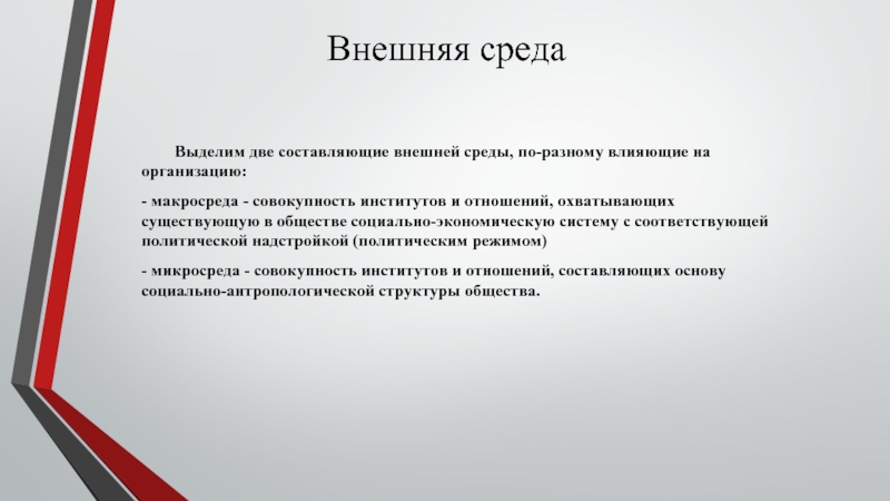 - микросреда - совокупность институтов и отношений, составляющих основу социально-антропологической структуры общества.