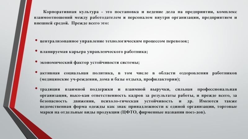 традиции взаимной поддержки и взаимной выручки, сильная профессиональная организация, высокая ответственность кадров за результаты работы, и прежде всего, за безопасность движения, психологическая устойчивость и др. Имеются также ведомственная форма одежды как знак принадлежности к единой организации, торговые марки на отдельные виды продукции (ЦФТО, фирменные названия поездов).