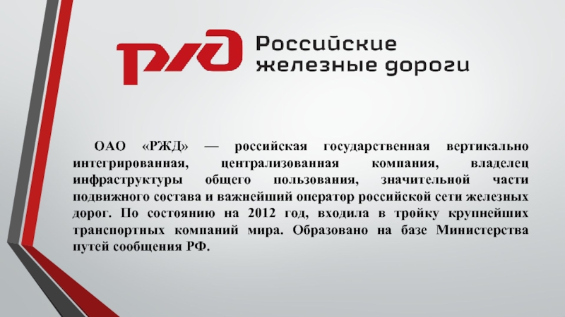 Слайд 2 ОАО «РЖД» — российская государственная вертикально интегрированная, централизованная компания, владелец инфраструктуры