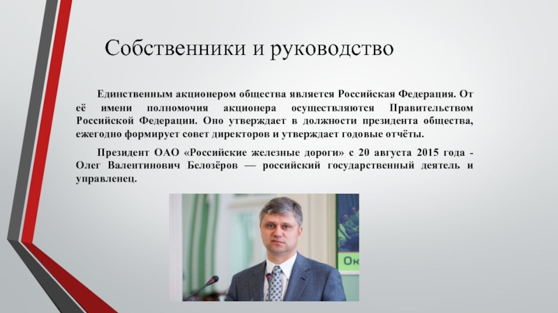 Президент ОАО «Российские железные дороги» с 20 августа 2015 года - Олег Валентинович Белозёров — российский государственный деятель и управленец.