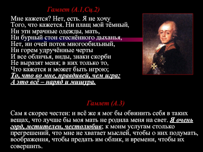 Сам я скорее честен: и всё же я мог бы обвинить себя в таких вещах, что лучше бы моя мать не родила меня на свет. Я очень горд, мстителен, честолюбив; к моим услугам столько прегрешений, что мне не хватает мыслей, чтобы о них подумать, воображения, чтобы предать им облик, и времени, чтобы их совершить.