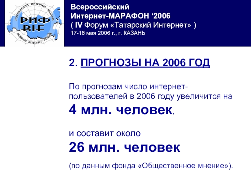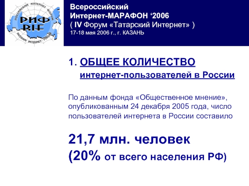 мнение», опубликованным 24 декабря 2005 года, число пользователей интернета в России составило