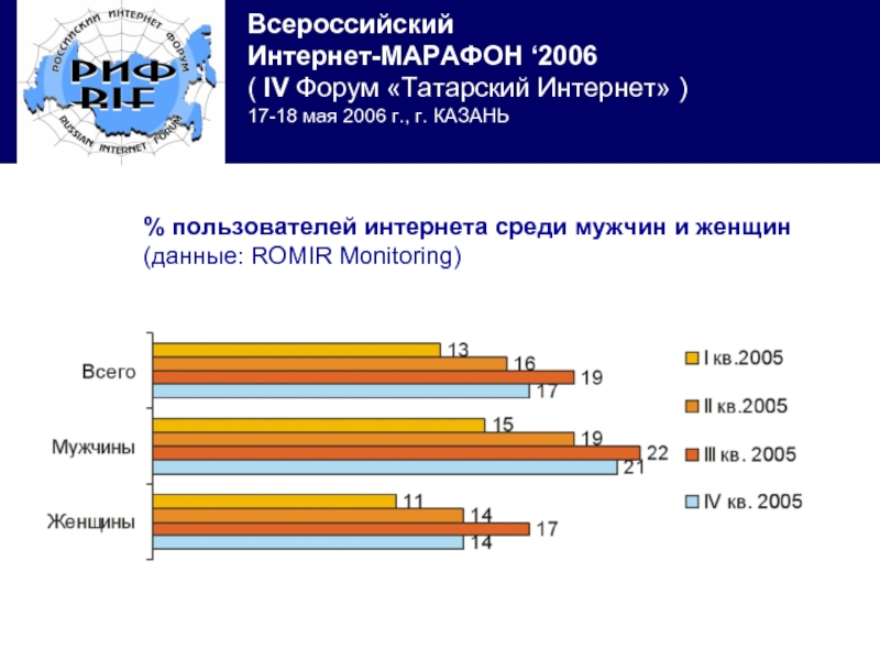 Слайд 12% пользователей интернета среди мужчин и женщин (данные: ROMIR Monitoring)