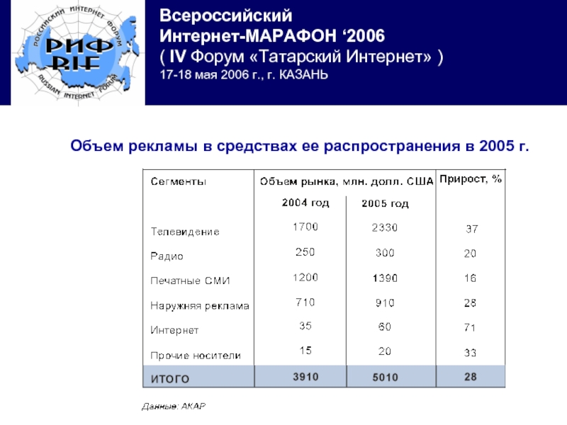 По данным АКАР объем инвестиций в интернет-рекламу превысит вложения в радио-рекламу к 2009 году.
