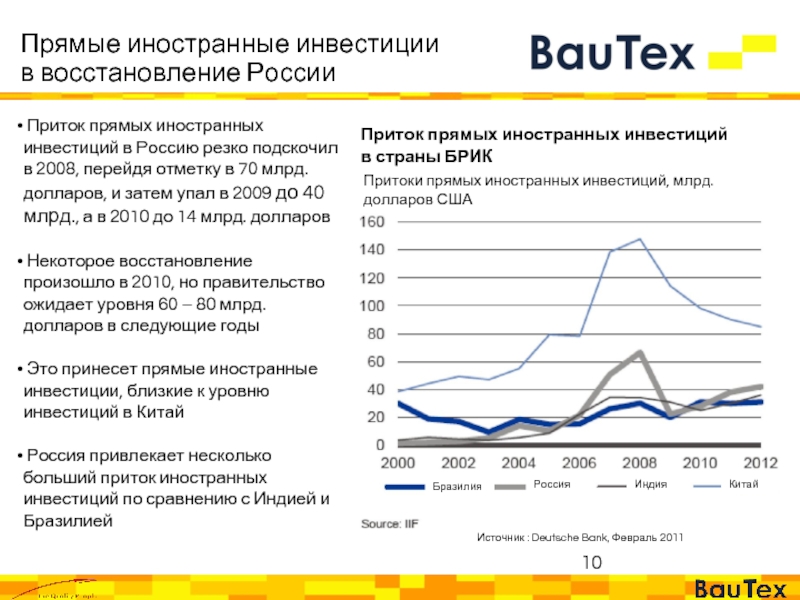 Приток прямых иностранных инвестиций в Россию резко подскочил в 2008, перейдя отметку в 70 млрд. долларов, и затем упал в 2009 до 40 млрд., а в 2010 до 14 млрд. долларов