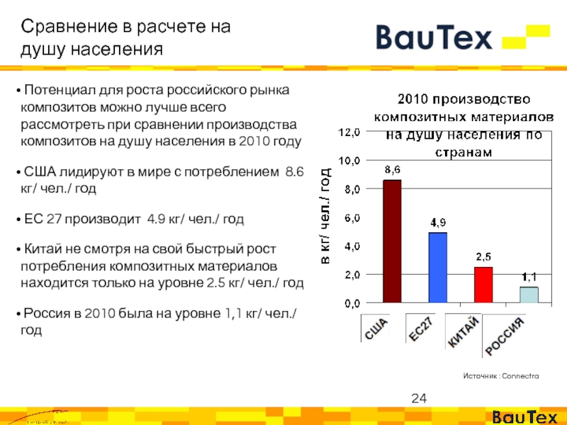российского рынка композитов можно лучше всего рассмотреть при сравнении производства композитов на душу населения в 2010 году