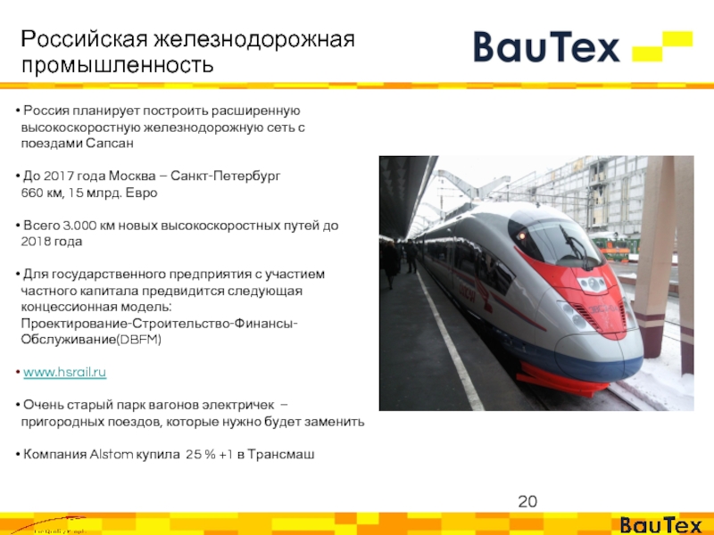 Слайд 20 Россия планирует построить расширенную высокоскоростную железнодорожную сеть с поездами Сапсан