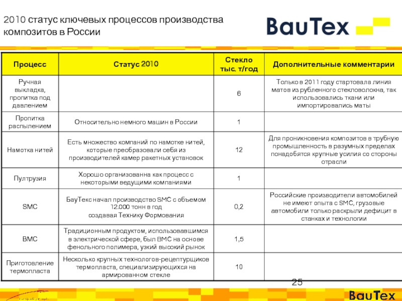Сегмент композитных материалов в России, который составил в 2010 году 156 тысяч тон (основан на 33% содержании стекла) вырос по ACGR на 16% по сравнению с объемом 2006 года в 86 тысяч тонн.