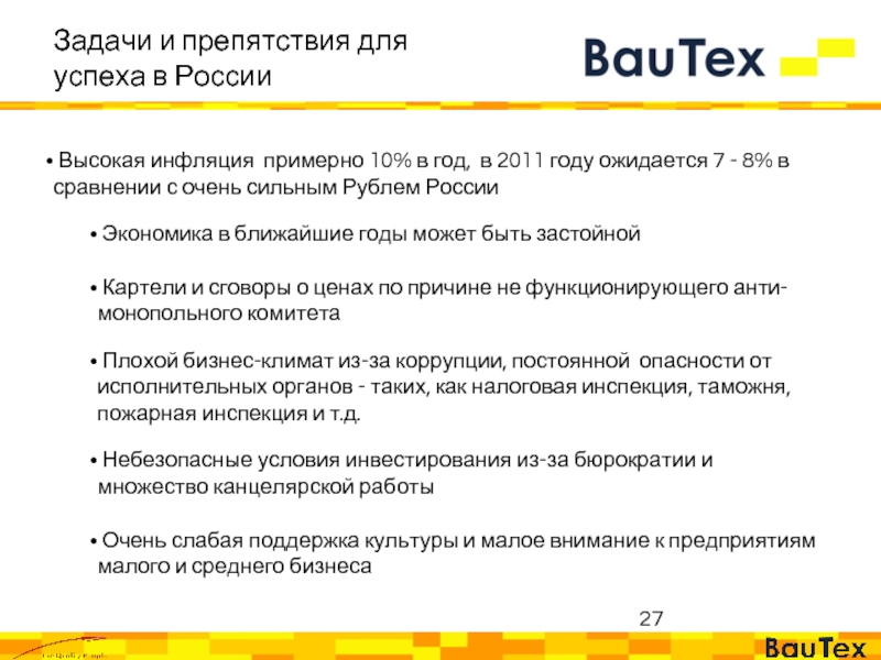 Слайд 27 Высокая инфляция примерно 10% в год, в 2011 году ожидается