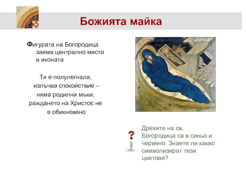Дрехите на св. Богородица са в синьо и червено. Знаете ли какво символизират тези цветове?