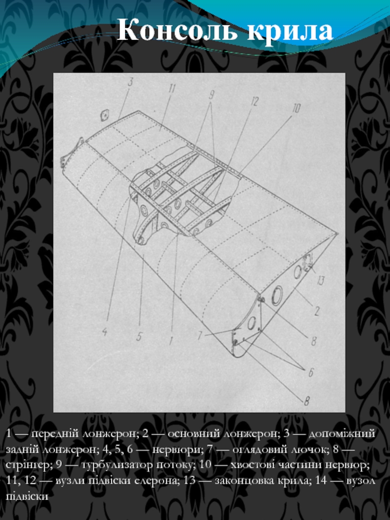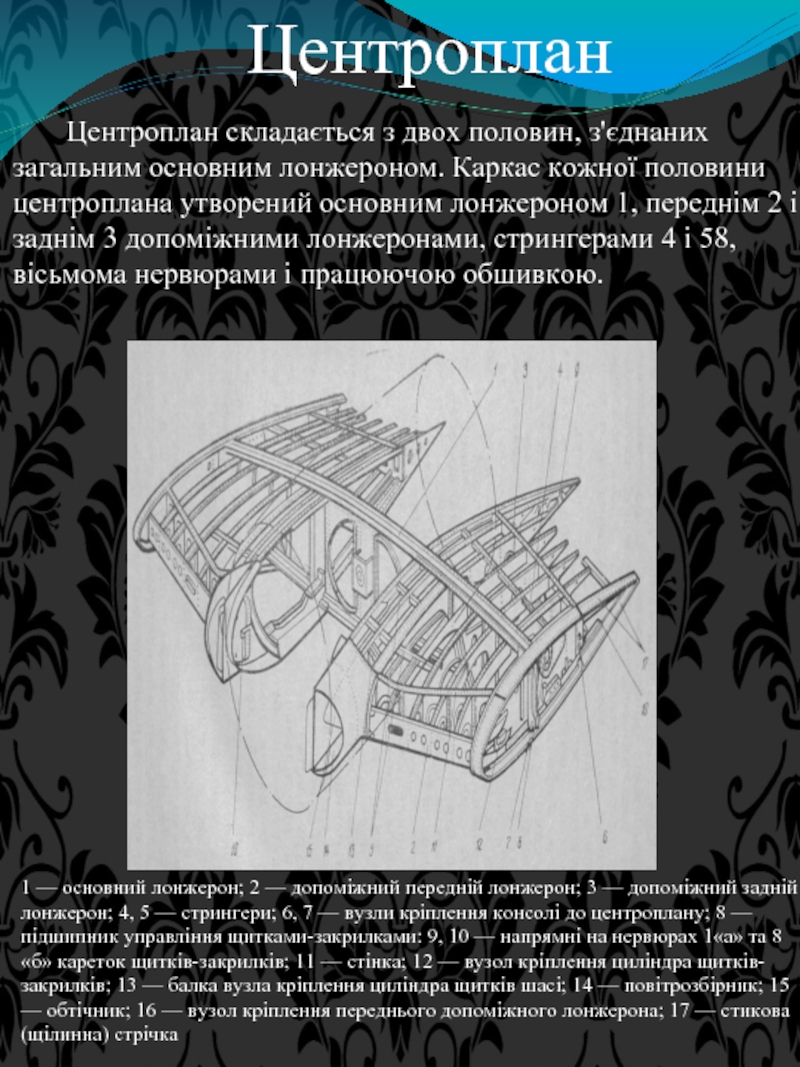 Центроплан складається з двох половин, з'єднаних загальним основним лонжероном. Каркас кожної половини центроплана утворений основним лонжероном 1, переднім 2 і заднім 3 допоміжними лонжеронами, стрингерами 4 і 58, вісьмома нервюрами і працюючою обшивкою.
