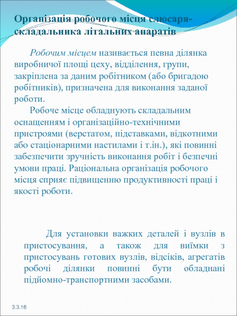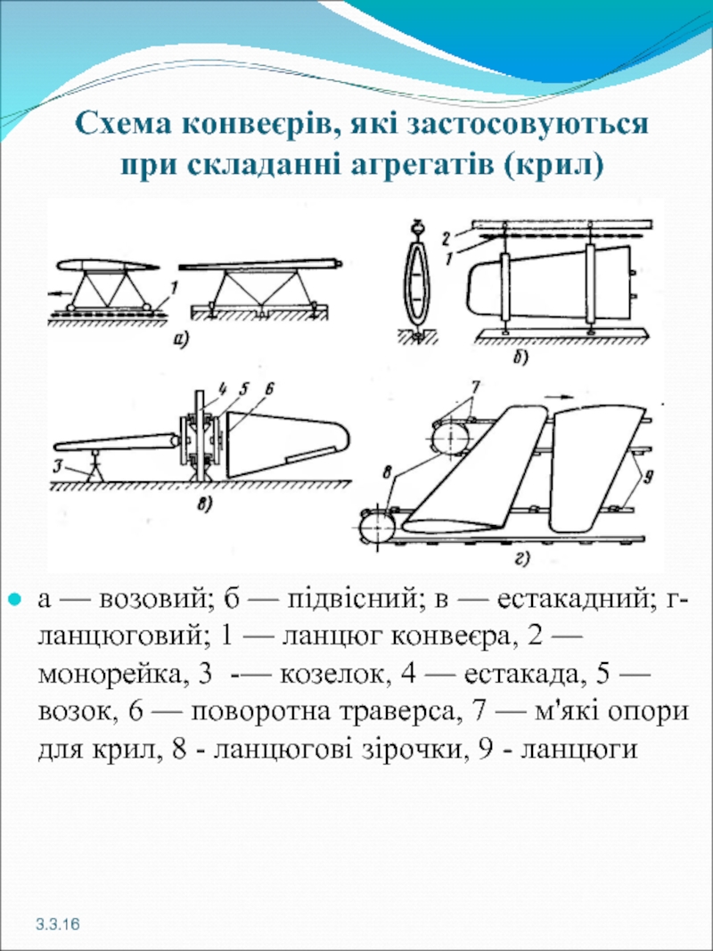 Для установки важких деталей і вузлів в пристосування, а також для виїмки з пристосувань готових вузлів, відсіків, агрегатів робочі ділянки повинні бути обладнані підйомно-транспортними засобами.