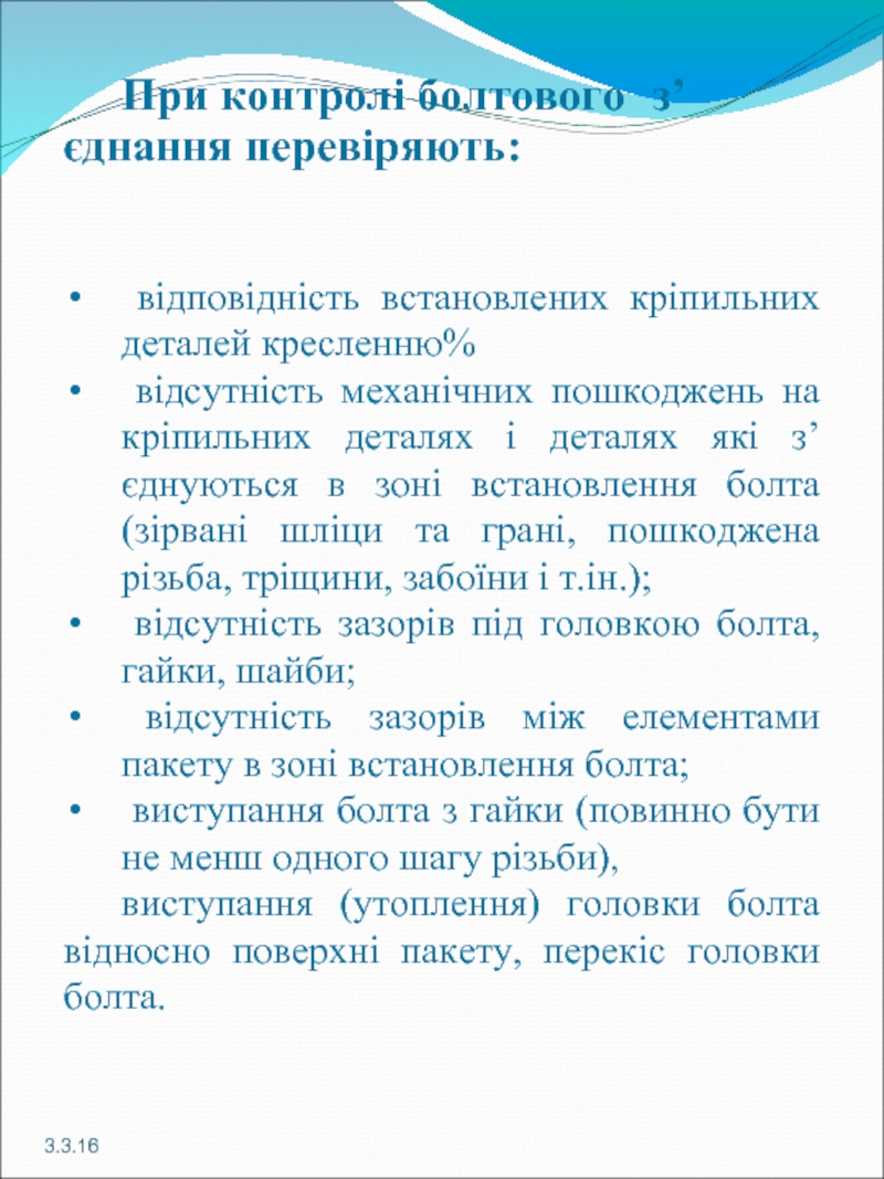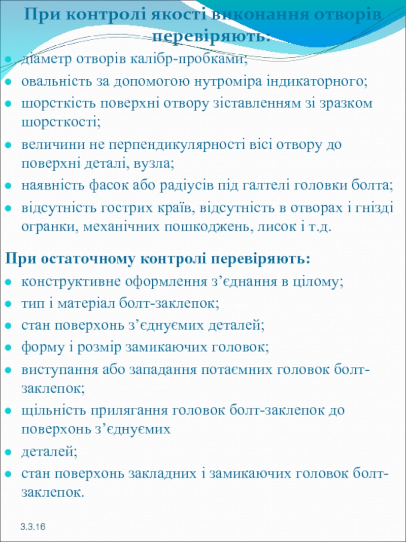 наявність фасок в отворі зі сторони розташування закладної головки;