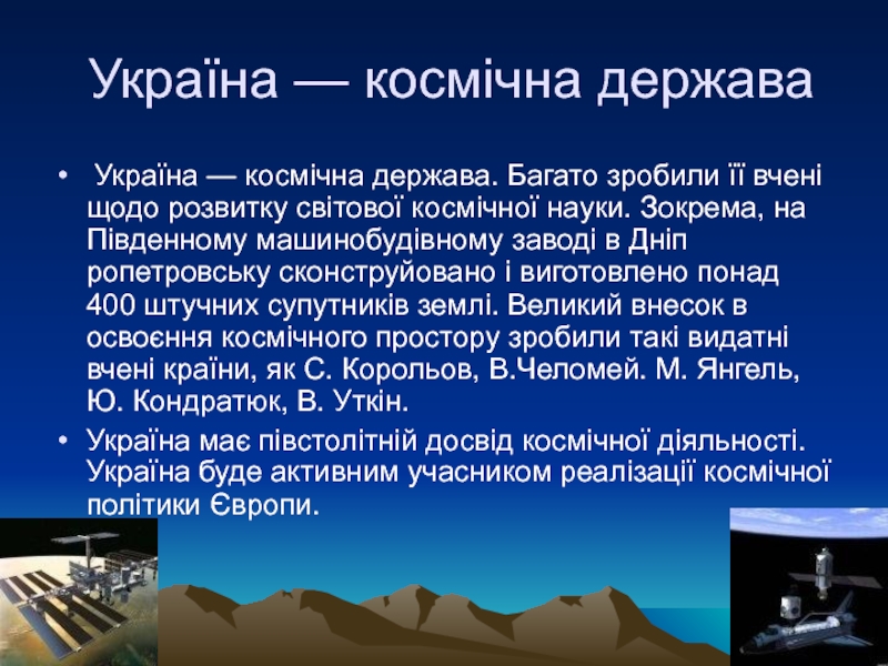 її вчені щодо розвит­ку світової космічної науки. Зокрема, на Південному машино­будівному заводі в Дніп­ропетровську сконст­руйовано і виготовлено понад 400 штучних су­путників землі. Вели­кий внесок в освоєн­ня космічного просто­ру зробили такі видатні вчені країни, як С. Корольов, В.Челомей. М. Янгель, Ю. Кондратюк, В. Уткін.