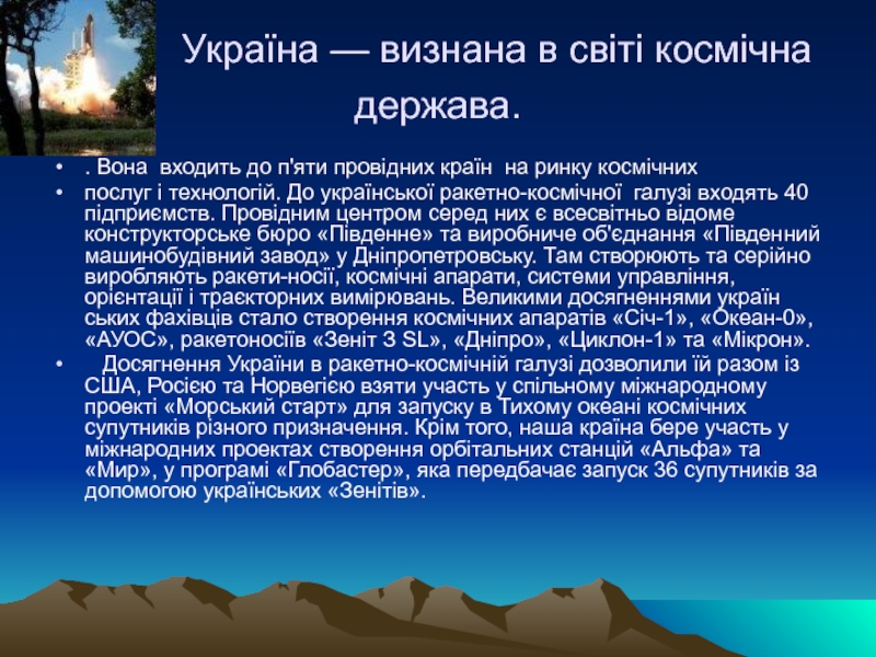 послуг і техно­логій. До української ракетно-космічної га­лузі входять 40 під­приємств. Провідним центром серед них є всесвітньо відоме конструкторське бюро «Південне» та виробниче об'єднання «Півден­ний машинобудівний завод» у Дніпропетровську. Там створю­ють та серійно виробляють ракети-носії, космічні апарати, системи управління, орієнтації і траєкторних вимірювань. Ве­ликими досягненнями україн­ських фахівців стало створення космічних апаратів «Січ-1», «Океан-0», «АУОС», ракето­носіїв «Зеніт З SL», «Дніпро», «Циклон-1» та «Мікрон».
