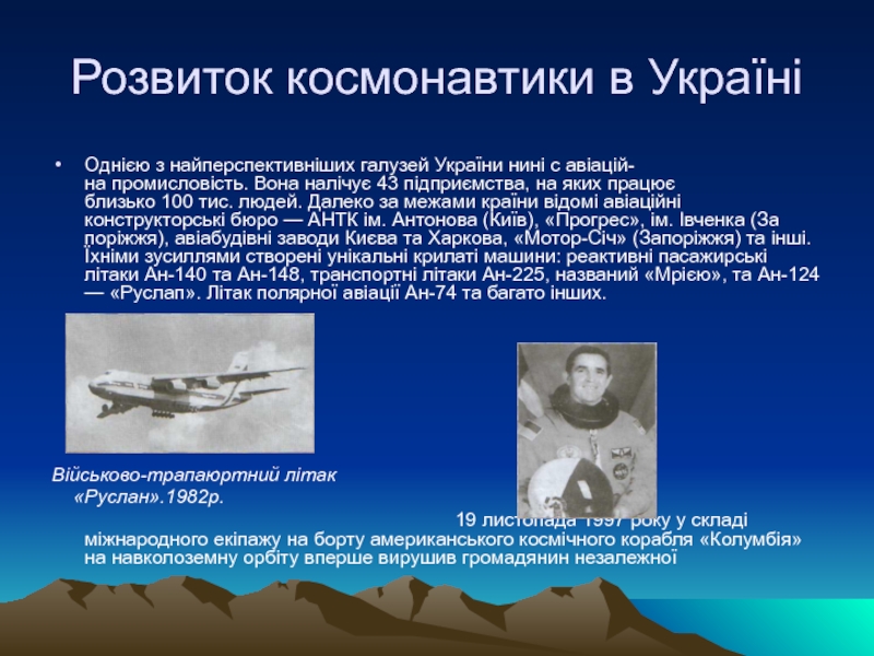авіацій-­ на промисловість. Вона налічує 43 підприємства, на яких працює близько 100 тис. людей. Далеко за межа­ми країни відомі авіа­ційні конструкторські бюро — АНТК ім. Антонова (Київ), «Про­грес», ім. Івченка (За­поріжжя), авіабудівні заводи Києва та Харкова, «Мотор-Січ» (Запоріжжя) та інші. Їхніми зусиллями створені унікальні крилаті машини: реактивні пасажирські літаки Ан-140 та Ан-148, транс­портні літаки Ан-225, названий «Мрією», та Ан-124 — «Руслап». Літак полярної авіації Ан-74 та багато інших.