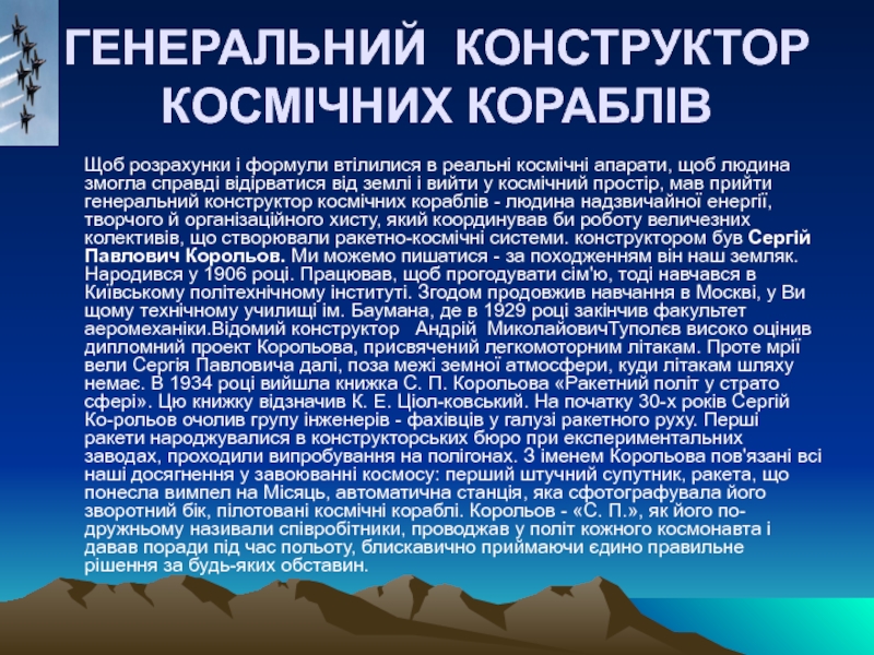 в реальні космічні апарати, щоб людина змог­ла справді відірватися від землі і вийти у космічний простір, мав прийти генеральний конструктор космічних кораблів - людина надзвичайної енергії, творчого й організа­ційного хисту, який координував би роботу величезних колективів, що створювали ра­кетно-космічні системи. конструкто­ром був Сергій Павлович Корольов. Ми можемо пишатися - за походженням він наш земляк. Народився у 1906 році. Пра­цював, щоб прогодувати сім'ю, тоді навчав­ся в Київському політехнічному інституті. Згодом продовжив навчання в Москві, у Ви­щому технічному училищі ім. Баумана, де в 1929 році закінчив факультет аеромеханіки.Відомий конструктор Андрій МиколайовичТуполєв високо оцінив дипломний проект Корольова, присвячений легкомоторним літа­кам. Проте мрії вели Сергія Павловича далі, поза межі земної атмосфери, куди літакам шляху немає. В 1934 році вийшла книжка С. П. Корольова «Ракетний політ у страто­сфері». Цю книжку відзначив К. Е. Ціол-ковський. На початку 30-х років Сергій Ко-рольов очолив групу інженерів - фахівців у галузі ракетного руху. Перші ракети наро­джувалися в конструкторських бюро при експериментальних заводах, проходили вип­робування на полігонах. З іменем Корольо­ва пов'язані всі наші досягнення у завою­ванні космосу: перший штучний супутник, ракета, що понесла вимпел на Місяць, авто­матична станція, яка сфотографувала його зворотний бік, пілотовані космічні кораблі. Корольов - «С. П.», як його по-дружньому називали співробітники, проводжав у політ кожного космонавта і давав поради під час польоту, блискавично приймаючи єдино пра­вильне рішення за будь-яких обставин.