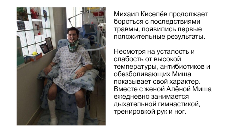 Слайд 3Михаил Киселёв продолжает бороться с последствиями травмы, появились первые положительные результаты. Несмотря