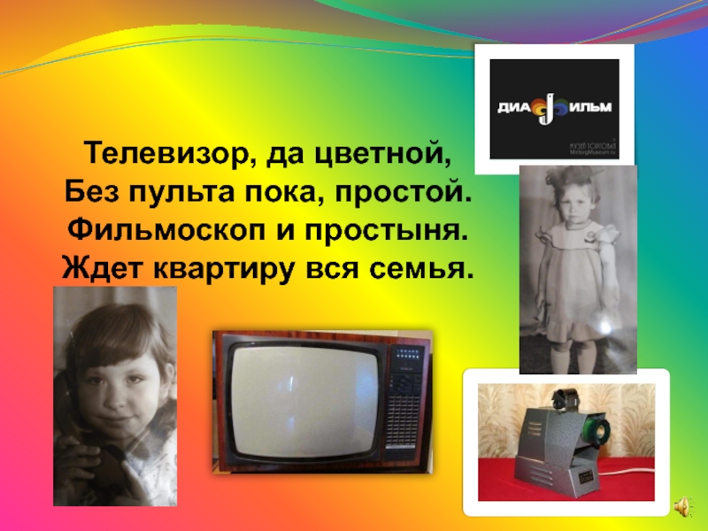 Слайд 6Телевизор, да цветной, Без пульта пока, простой. Фильмоскоп и простыня. Ждет квартиру вся семья.
